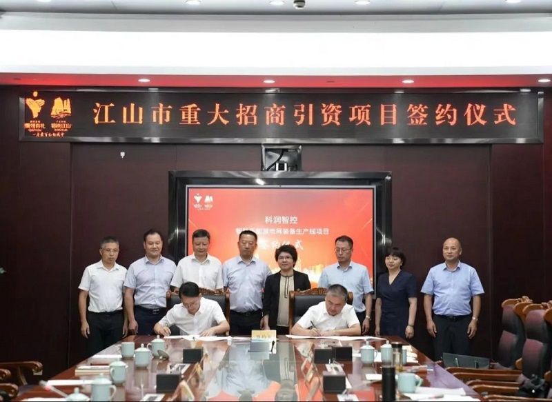 儀式上,公司董事長王榮與江山經濟開發區簽約科潤智控智慧新能源電網裝備生產線項目。